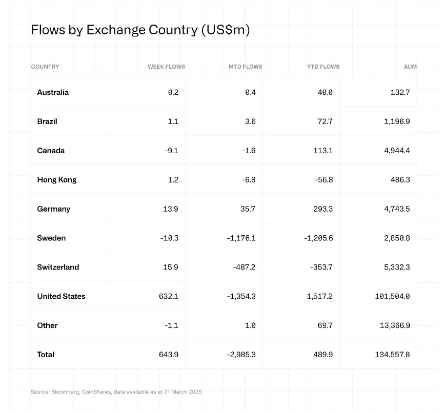 CoinShares lưu ý rằng phần lớn dòng tiền đổ vào có nguồn gốc từ Hoa Kỳ, chiếm 632 triệu USD, chủ yếu do iShares Bitcoin Trust (IBIT) của BlackRock thúc đẩy.