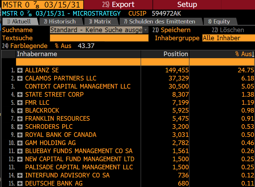 Allianz — công ty bảo hiểm lớn thứ hai ở châu Âu — đã mua lại 24,75% trong tổng số 2,6 tỷ USD trái phiếu bán ra của MicroStrategy cho các nhà đầu tư tổ chức, kết thúc vào ngày 21 tháng 11.