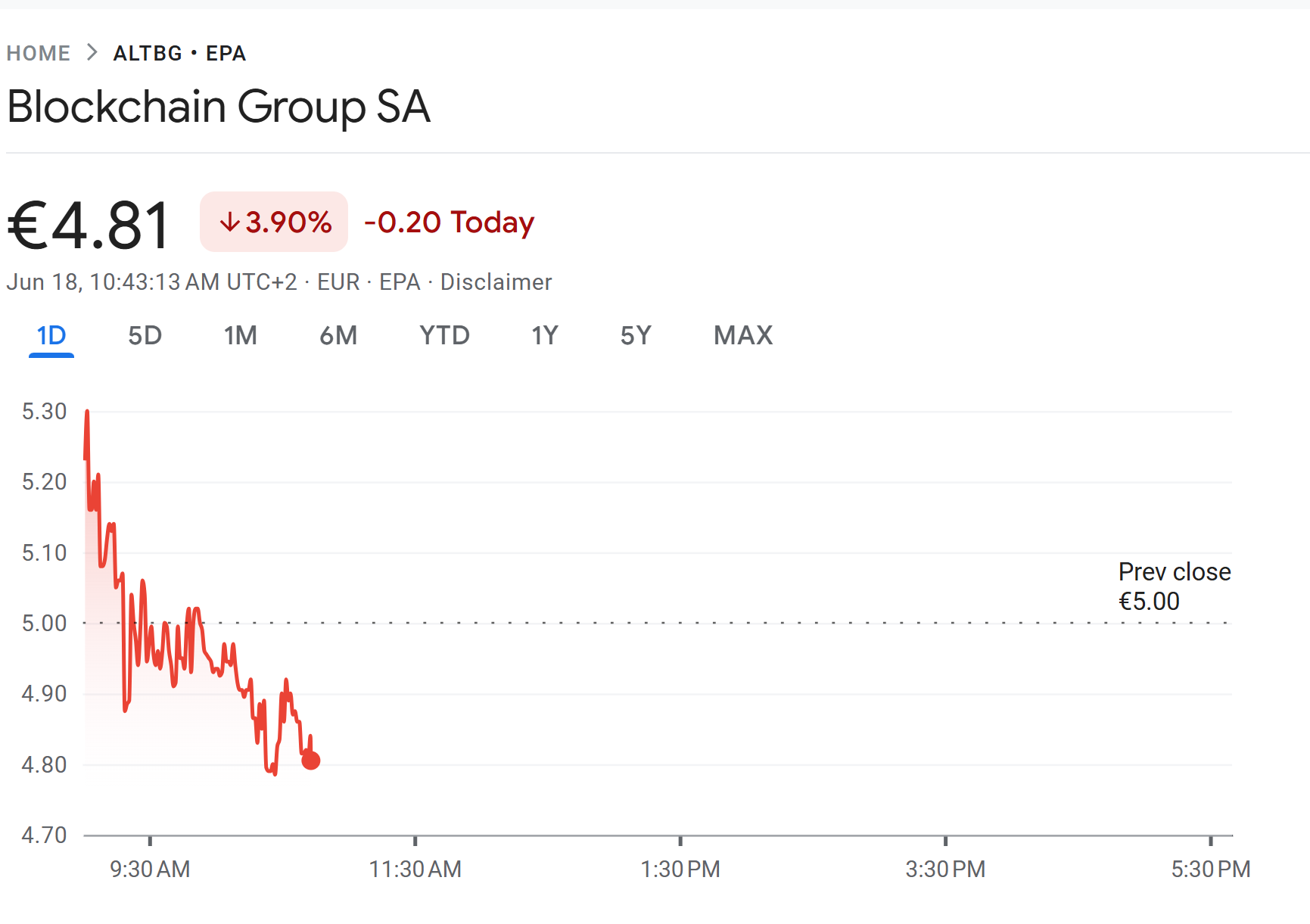 Blockchain Group được giao dịch dưới mã chứng khoán ALTBG trên Euronext Growth Paris. Theo dữ liệu từ Google Finance, cổ phiếu của công ty đã giảm 3,9% hôm nay.