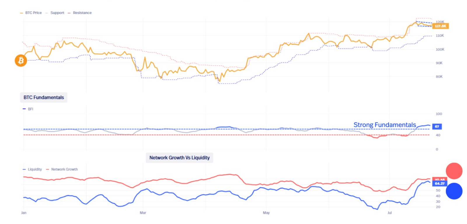 Chỉ số Bitcoin Fundamental Index (BFI) vẫn duy trì ở mức cao, phản ánh sự tăng trưởng của mạng lưới và tính thanh khoản ngày càng gia tăng, như được minh họa trong biểu đồ dưới.