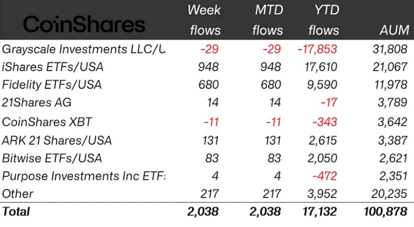 Trong số những quỹ ghi nhận dòng vốn vào, quỹ iShares ETF ở Mỹ ghi nhận dòng vốn vào nhiều nhất, với 948 triệu USD, trong khi Fidelity ETF theo sau ở vị trí thứ hai, ghi nhận 680 triệu USD.