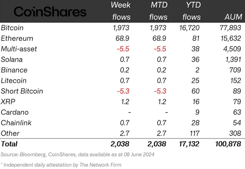 Dòng tiền điện tử đạt 2 tỷ USD trong tháng 6, Ethereum chứng kiến ​​tuần tốt nhất kể từ tháng 3 với 69 triệu USD