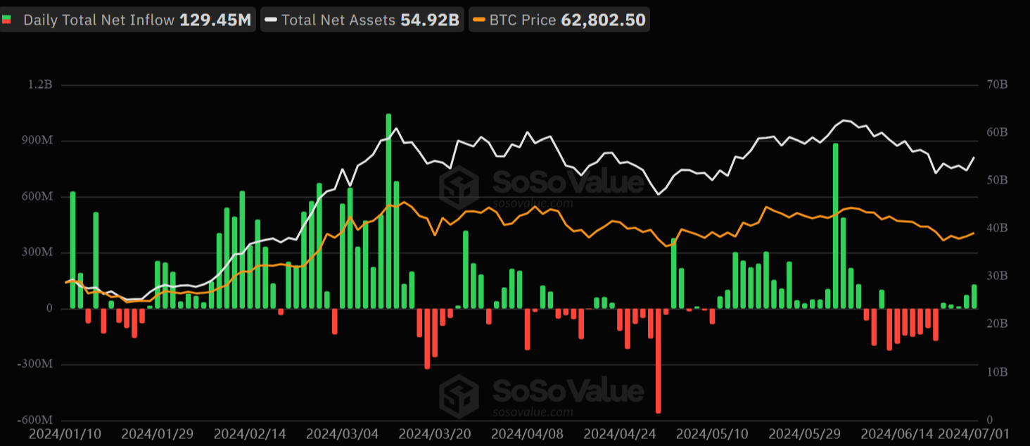 Dòng tiền 129,45 triệu USD chảy vào ngày 1 tháng 7 cũng là dòng tiền chảy vào ETF cao nhất kể từ ngày 7 tháng 6. Khi dòng tiền chảy vào Bitcoin ETF chuyển sang tích cực, giá BTC đã lấy lại 63.000 USD sau gần ba tuần chật vật vượt qua ngưỡng kháng cự quan trọng ở mức 62.000 USD.
