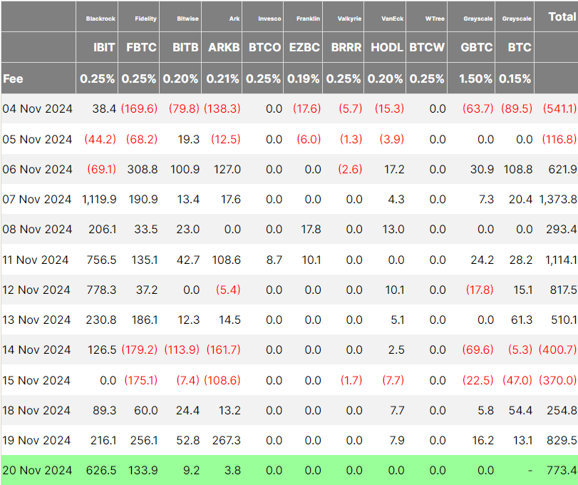 Dòng tiền đổ vào quỹ Bitcoin ETF spot cũng tiếp tục hỗ trợ cho đà tăng giá của Bitcoin. Dữ liệu của Farside Investors cho thấy các quỹ Bitcoin ETF của Hoa Kỳ đã tích lũy được hơn 773 triệu USD dòng tiền tích cực ròng vào ngày 20 tháng 11, đánh dấu ngày có dòng tiền vào thứ ba liên tiếp.