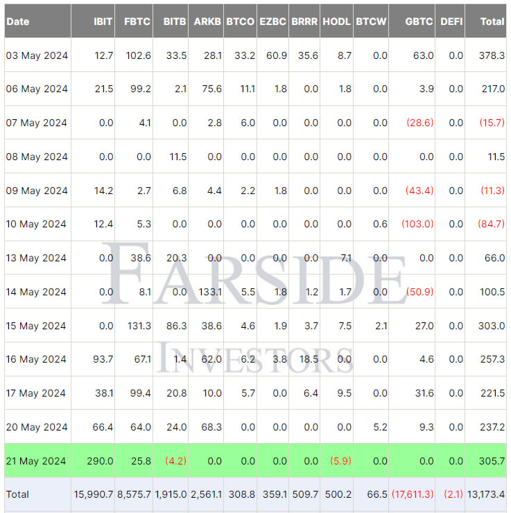 Theo dữ liệu sơ bộ từ Farside Investor, iShares Bitcoin Trust (IBIT) của BlackRock đã ghi nhận dòng vốn vào lớn 290 triệu USD vào ngày 21 tháng 5. Dòng vốn vào ròng của tất cả 11 tổ chức phát hành ETF cộng lại là 305,7 triệu USD.