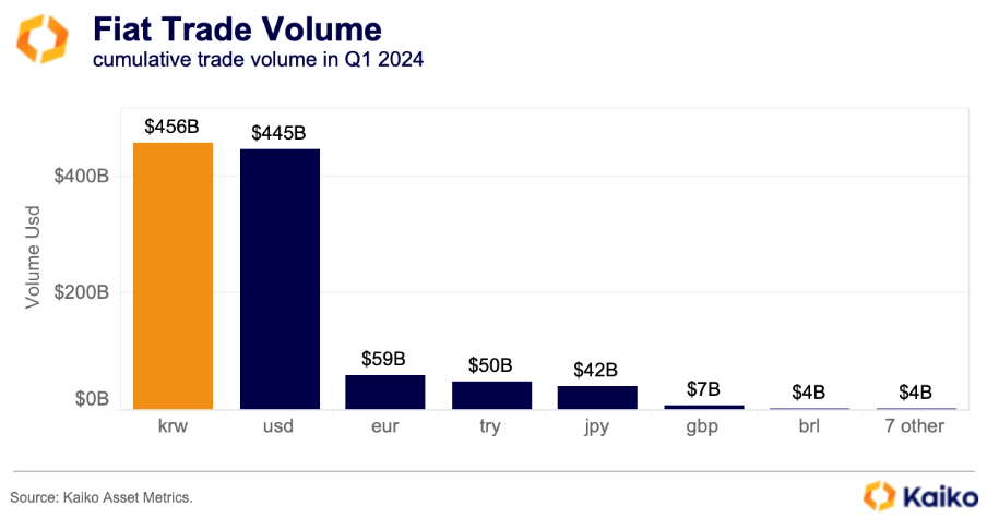 Theo báo cáo nghiên cứu ngày 15 tháng 4 của Kaiko, đồng won chiếm khối lượng giao dịch trị giá hơn 456 tỷ USD trên các sàn giao dịch tiền điện tử tập trung, vượt qua khối lượng đô la Mỹ.