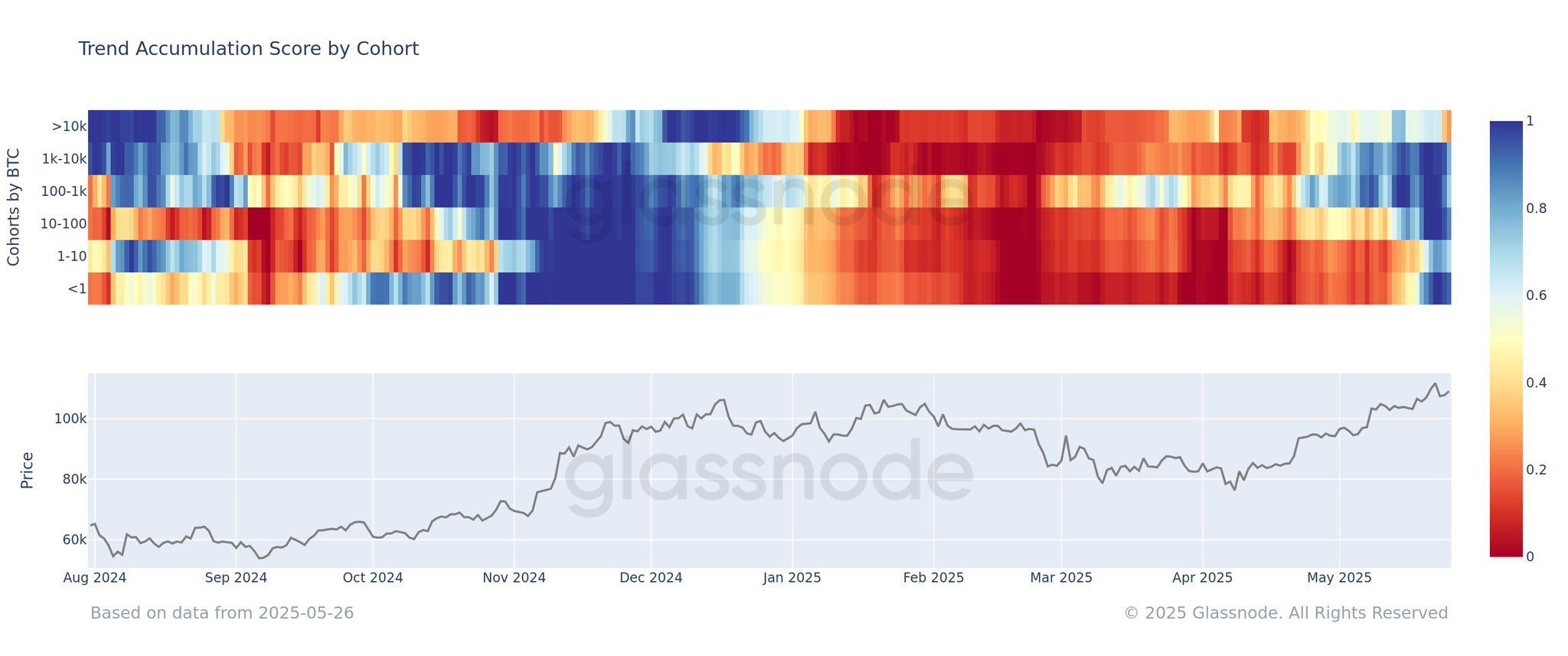 Dữ liệu từ Glassnode xác nhận xu hướng này. Vào tháng 05, điểm tích lũy cho các ví nắm giữ trên 10,000 BTC đã giảm từ khoảng 0.8 xuống dưới 0.5. Sự thay đổi này được thể hiện bằng sự chuyển màu từ xanh sang cam.