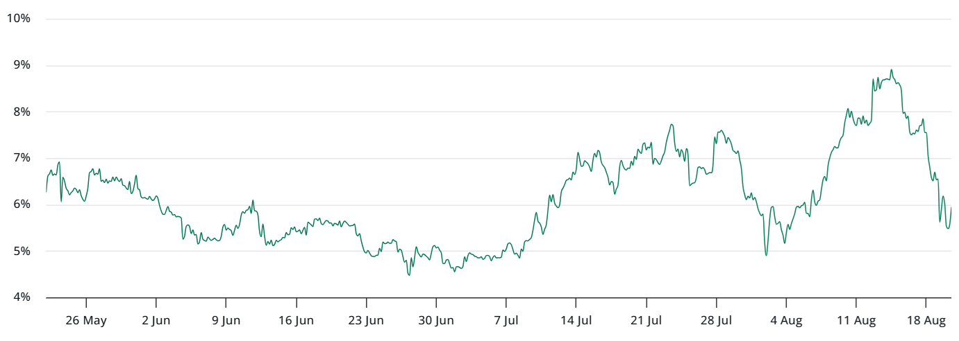 Phí bảo hiểm hợp đồng tương lai ETH vẫn duy trì trên ngưỡng trung tính 5% trong suốt đợt giảm giá, cho thấy niềm tin của thị trường. Thông thường, hợp đồng tương lai theo tháng giao dịch cao hơn thị trường giao ngay để phản ánh thời gian tất toán dài hơn. Tuy nhiên, tín hiệu tăng giá đáng kể cuối cùng từ chỉ báo này xuất hiện vào tháng 1. Ngay cả đợt ETH tăng 100% từ 1/7 đến 13/8 cũng không thể khôi phục hoàn toàn sự lạc quan của trader.