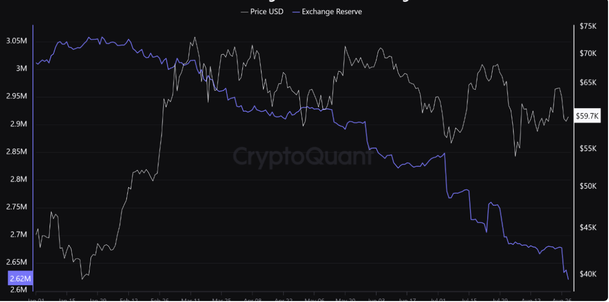 Theo dữ liệu của CryptoQuant, dự trữ Bitcoin trên các sàn giao dịch đã giảm khoảng 12,9% kể từ ngày 1 tháng 1, chỉ còn 2,62 triệu Bitcoin trên tất cả các sàn giao dịch tiền điện tử lớn.