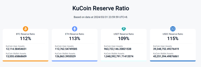 Báo cáo PoR mới nhất của KuCoin cho thấy tỷ lệ dự trữ tài sản do người dùng nắm giữ bao gồm 12.115 Bitcoin (BTC), 112.763 Ethereum (ETH), 963,72 triệu USDT và 39,35 triệu USDC. Số tiền hiện tại phản ánh sự sụt giảm đáng kể trong việc nắm giữ các loại tiền điện tử quan trọng.