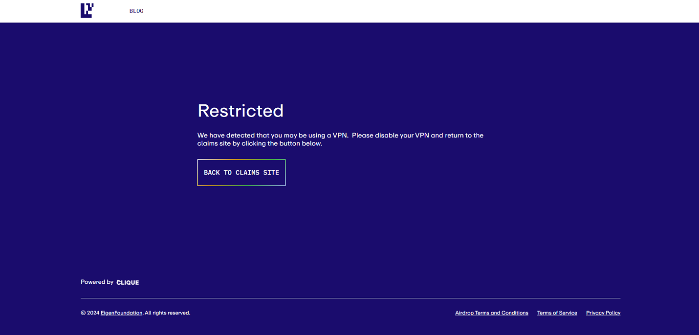 Theo tài liệu của Eigenlayer, token không có sẵn cho người dùng ở hơn 30 khu vực pháp lý, bao gồm Mỹ, Nga, Trung Quốc và Canada. Hầu hết các địa chỉ máy chủ VPN cũng bị cấm sử dụng để claim token.