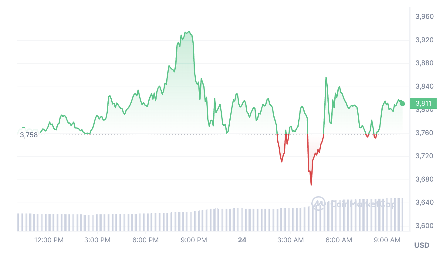 Vào ngày 23 tháng 5, Ủy ban Chứng khoán và Giao dịch đã phê duyệt 8 quỹ Ether ETF spot. Ether đã giảm 3,4% ngay trước tin tức này, phục hồi khoảng 5% ngay sau đó và hiện đang giao dịch ở mức 3.806 USD.