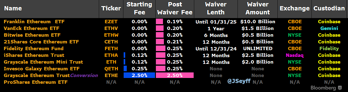 Sau đó, tất cả các Ether ETF ngoại trừ ETHE sẽ cung cấp mức phí cơ bản từ 0,15% đến 0,25%. Phí của ETHE vẫn ở mức 2,5%.