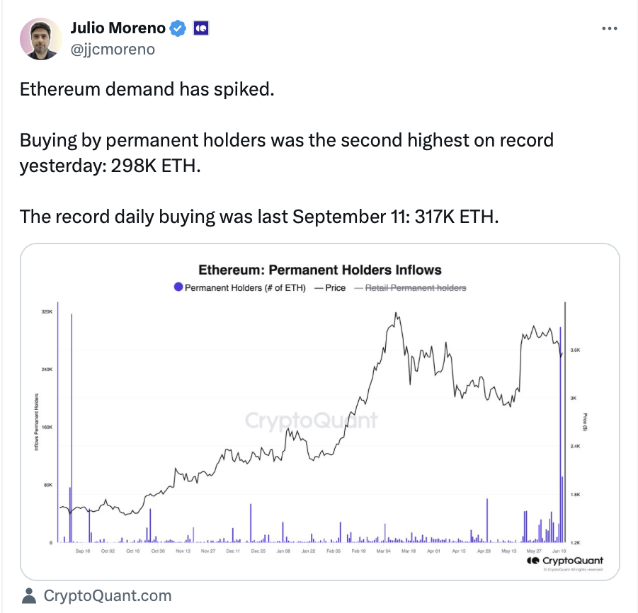 “Nhu cầu Ethereum đã tăng vọt. Việc mua của những người nắm giữ vĩnh viễn là mức cao thứ hai được ghi nhận vào ngày hôm qua”, Julio Moreno, người đứng đầu bộ phận nghiên cứu của CryptoQuant đã viết trong một bài đăng trên X vào ngày 13 tháng 6.