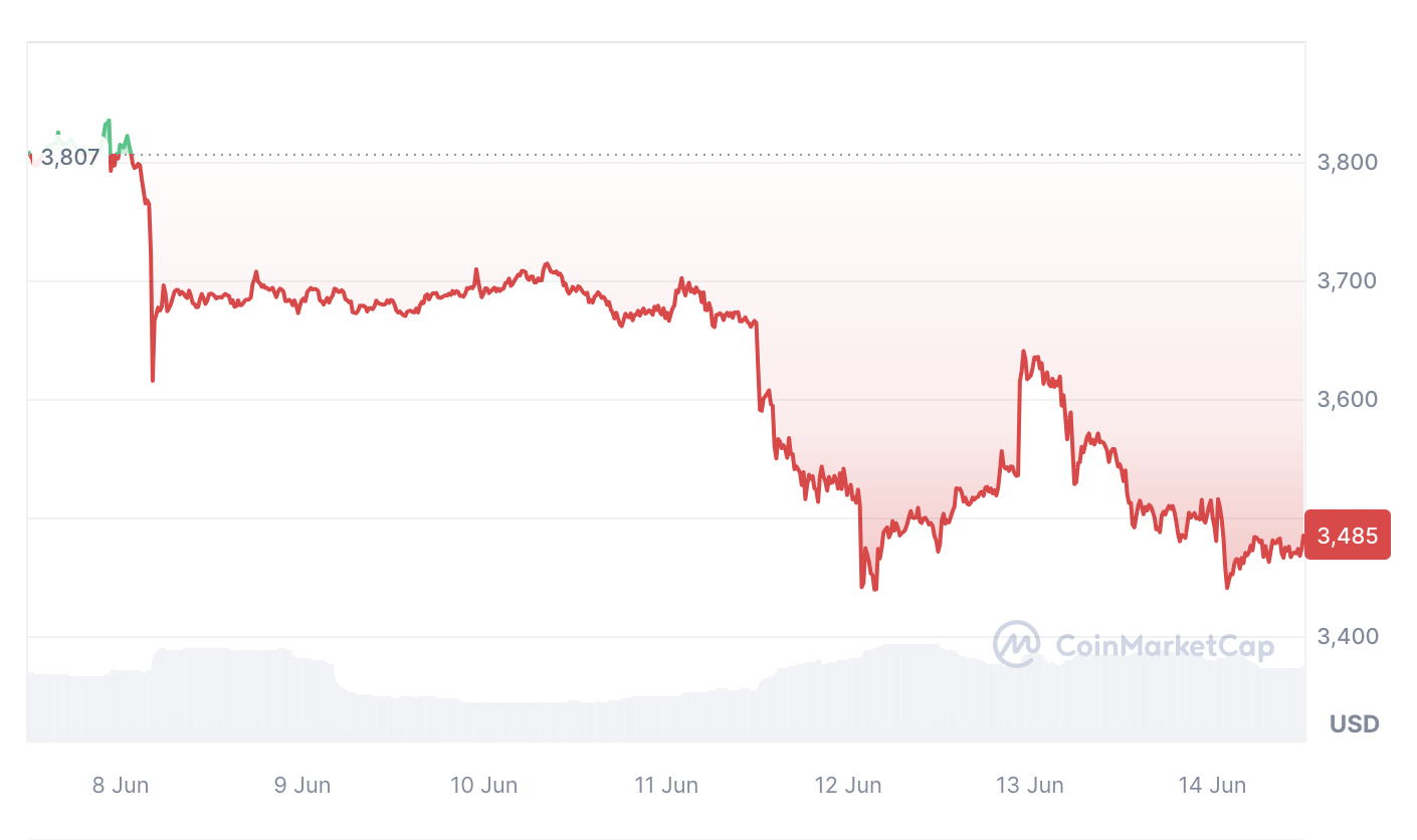 Nhu cầu gia tăng diễn ra trong bối cảnh giá ETH giảm 8,49% trong bảy ngày qua. Theo dữ liệu của CoinMarketCap, ban đầu giảm xuống dưới 3.800 USD vào ngày 8 tháng 6, nó không thể phục hồi trở lại nhưng vẫn duy trì trên 3.400 USD trong suốt thời gian đó.