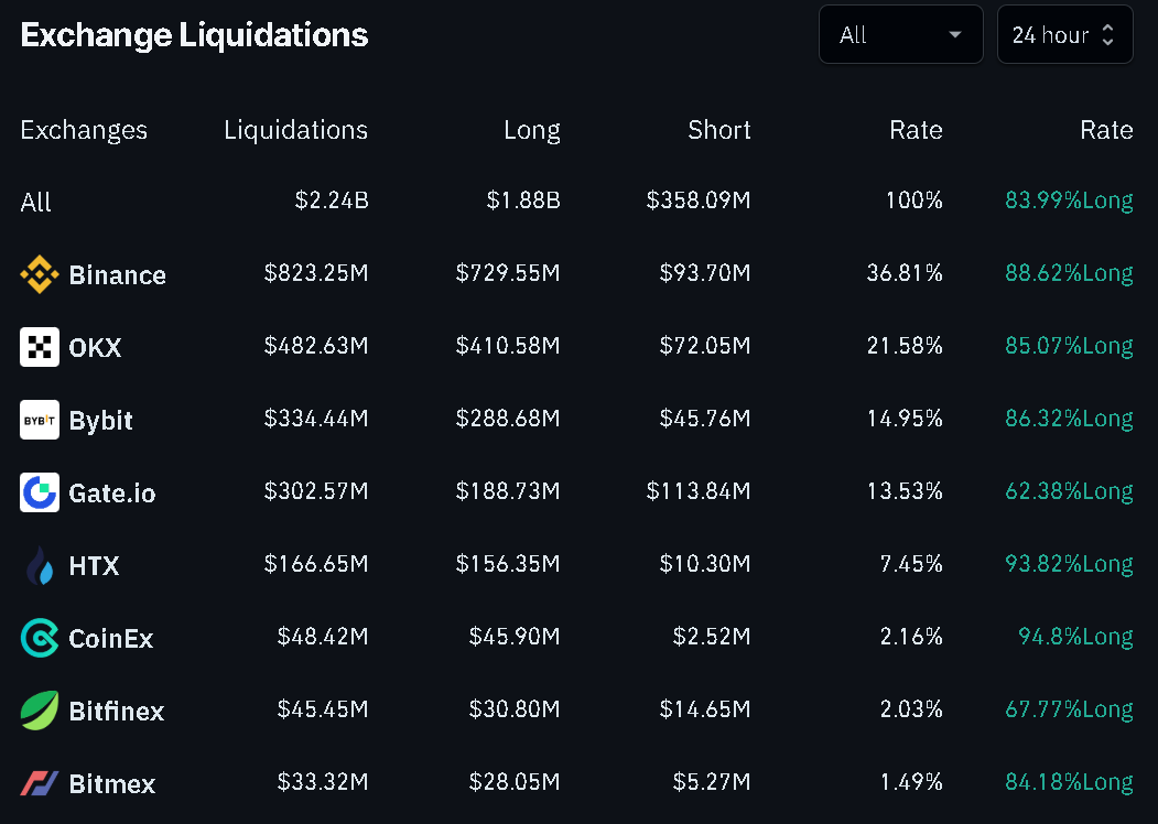Trong khung thời gian này, 36,8% tổng số vụ thanh lý diễn ra trên Binance, do lượng người dùng khổng lồ của sàn này. Các sàn giao dịch tiền điện tử khác có giá trị thanh lý cao tiếp theo là OKX, Bybit, Gate.IO và HTX.