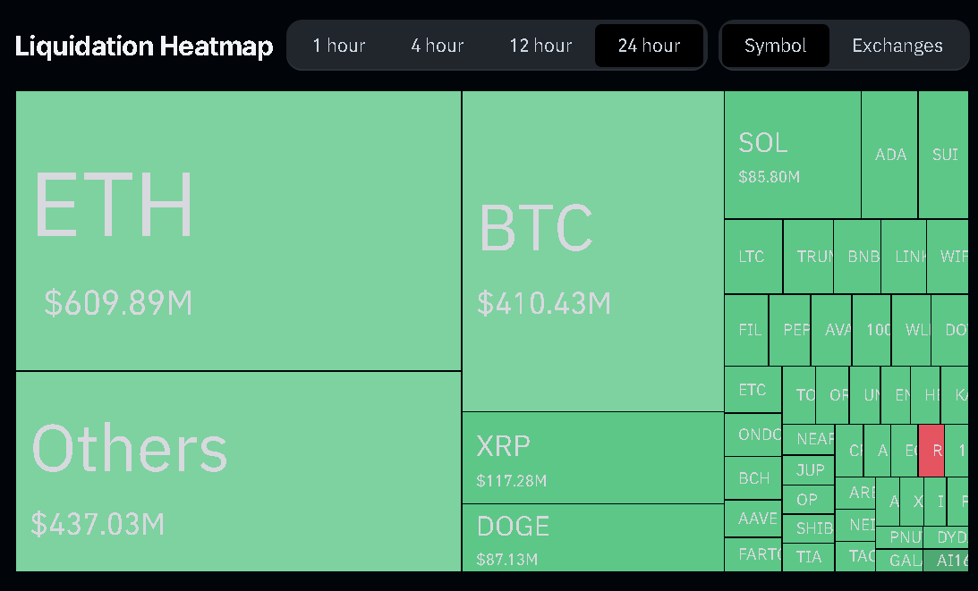 Hơn 2,24 tỷ USD đã được thanh lý khỏi thị trường tiền điện tử trong 24 giờ qua trong bối cảnh bất ổn địa chính trị ngày càng gia tăng phát sinh từ cuộc chiến thuế quan toàn cầu. Ether dẫn đầu, với tổng giá trị thanh lý dài hạn và ngắn hạn lên tới hơn 609,9 triệu USD.