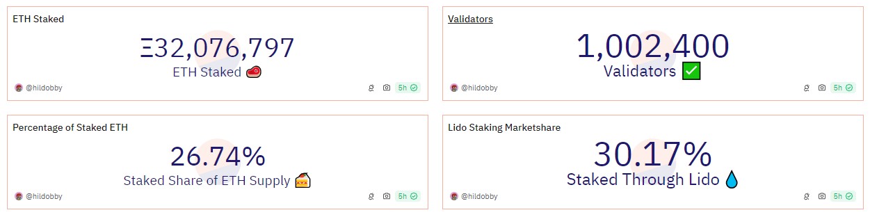 Vào ngày 28 tháng 3, bảng điều khiển Dune Analytics do Hildobby tạo để theo dõi tiến trình staking Ethereum cho thấy mạng đã đạt được số lượng người xác thực là một triệu, với 32 triệu ETH được staking, chiếm 26% tổng nguồn cung.