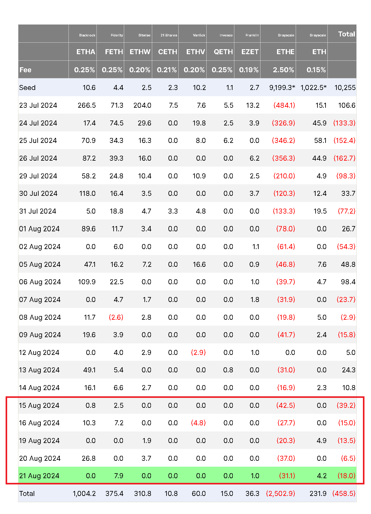 Như đã trình bày ở trên, hệ sinh thái Ether ETF đã chứng kiến ​​chuỗi thoái vốn dài nhất, mất 92,2 triệu USD trong năm ngày từ ngày 15 tháng 8 đến ngày 21 tháng 8.