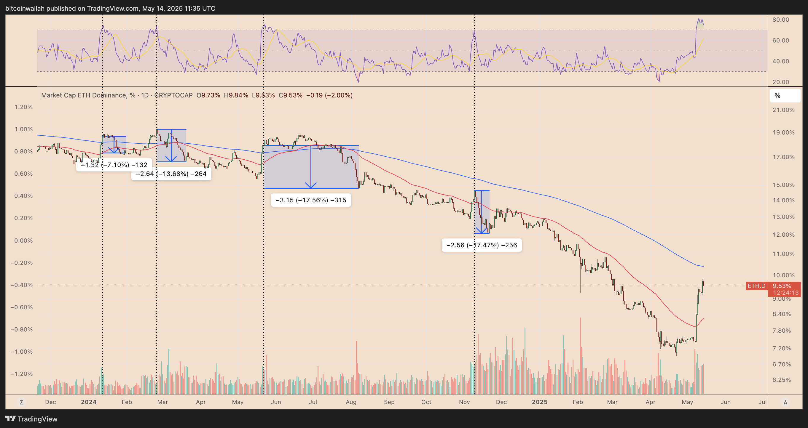 Về mặt lịch sử, những mức RSI cực đoan như vậy trên ETH.D thường báo hiệu sự bắt đầu của các đợt điều chỉnh lớn. Một ví dụ điển hình đã xảy ra vào đầu tháng 7/2024, khi mức độ thống trị của ETH đạt đỉnh tại các mức RSI tương tự, ngay trước khi xảy ra đợt giảm sâu.