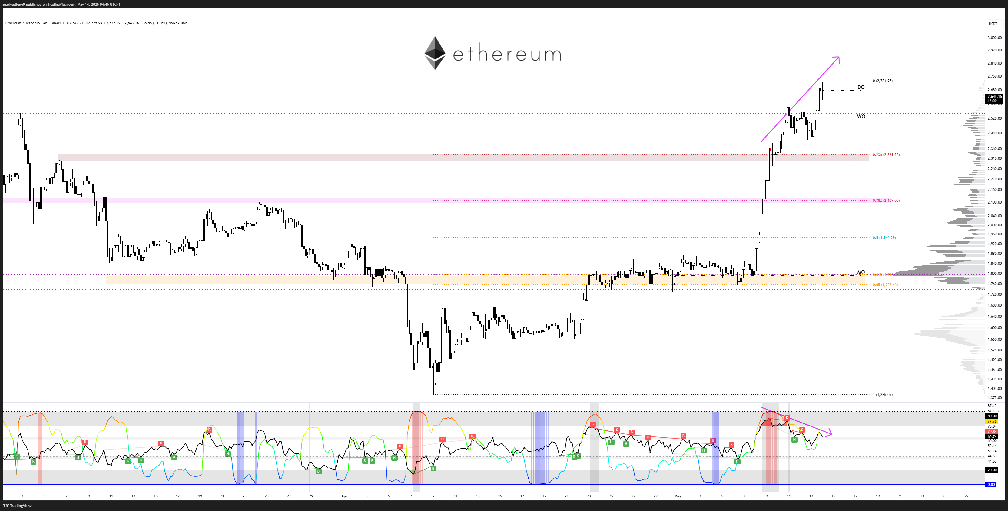 Trên biểu đồ ETH/USD bốn giờ, một sự phân kỳ giảm giá cổ điển đang xuất hiện, trong đó giá Ethereum tiếp tục đạt mức cao hơn, nhưng các chỉ báo động lượng lại có xu hướng giảm.