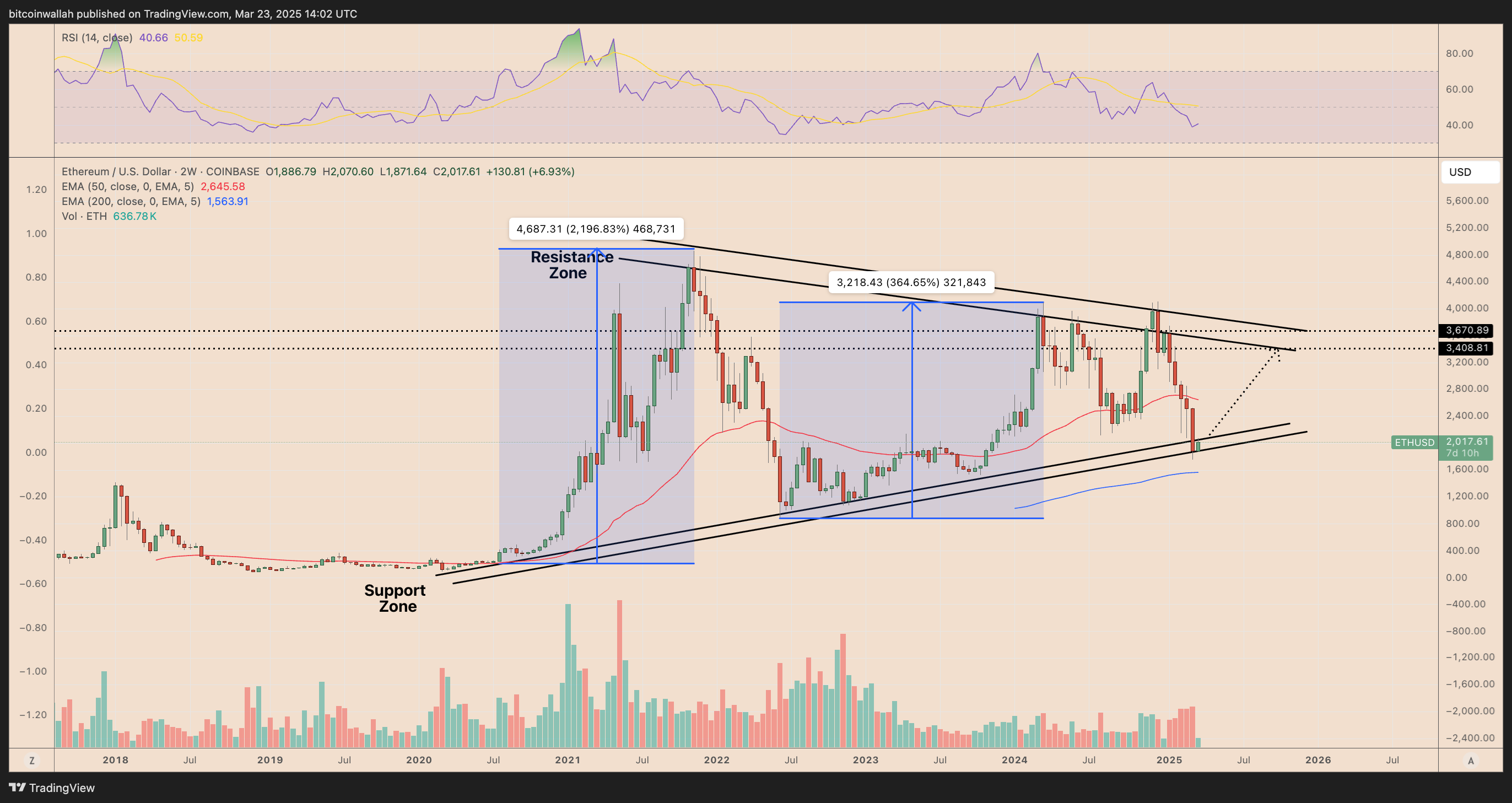 Về mặt kỹ thuật, giá Ether đang hướng đến một sự đột phá tiềm năng khi nó kiểm tra lại vùng hỗ trợ dài hạn. Theo lịch sử, sự phục hồi từ mức hỗ trợ nhiều năm này đã dẫn đến các đợt tăng giá bùng nổ — đáng chú ý nhất là mức tăng hơn 2.000% và 360% trong các chu kỳ trước.