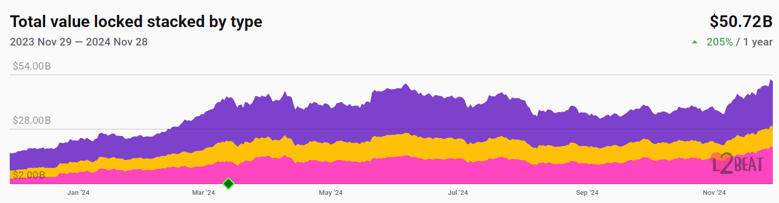 Dữ liệu của L2beat cho thấy con số này đánh dấu mức tăng hơn 205% về TVL tích lũy, từ mức chỉ 16,6 tỷ USD vào tháng 11 năm 2023.
