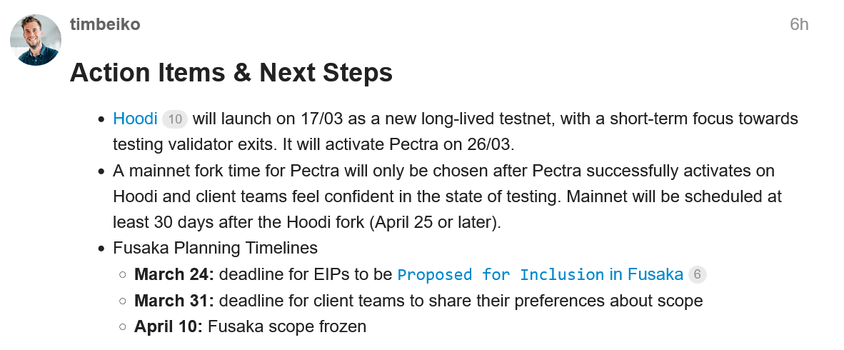 Nhà phát triển của Ethereum Foundation, Tim Beiko, cho biết sau Cuộc họp nhà phát triển vào ngày 13 tháng 3, testnet Hoodi sẽ ra mắt vào ngày 17 tháng 3 và bản nâng cấp Pectra sẽ được kích hoạt vào ngày 26 tháng 3.