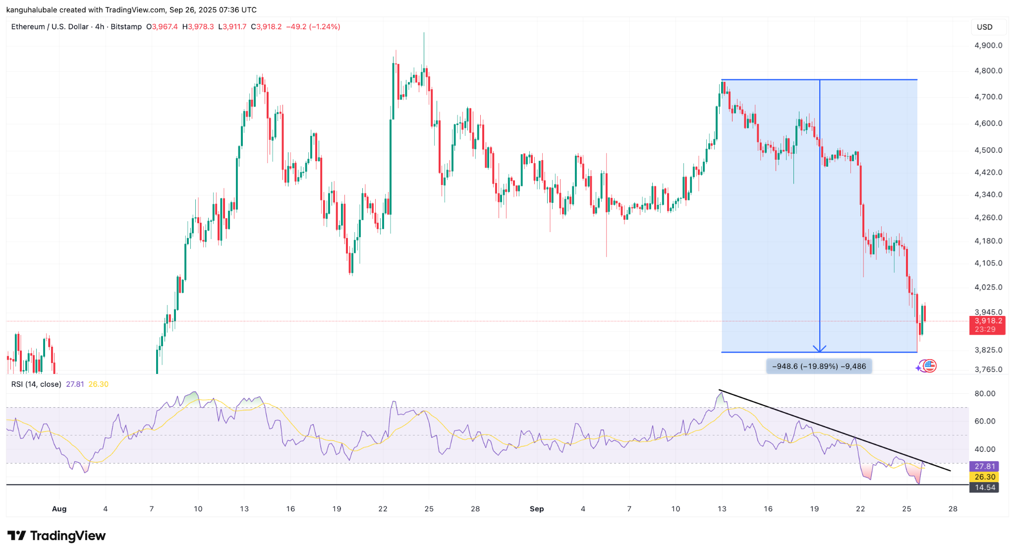 Việc Ether giảm 20% xuống dưới 4.000 USD từ 4.800 USD trong hai tuần qua đã tác động đáng kể đến RSI trong khung thời gian thấp.