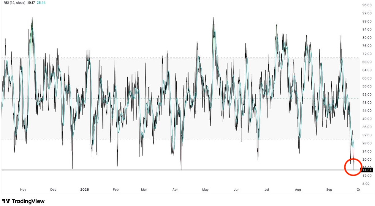 Chỉ trong vòng 19 lần trong 10 năm, chỉ số RSI 4H của ETH đã giảm xuống dưới mức 15 — một tín hiệu bán quá mức hiếm gặp.