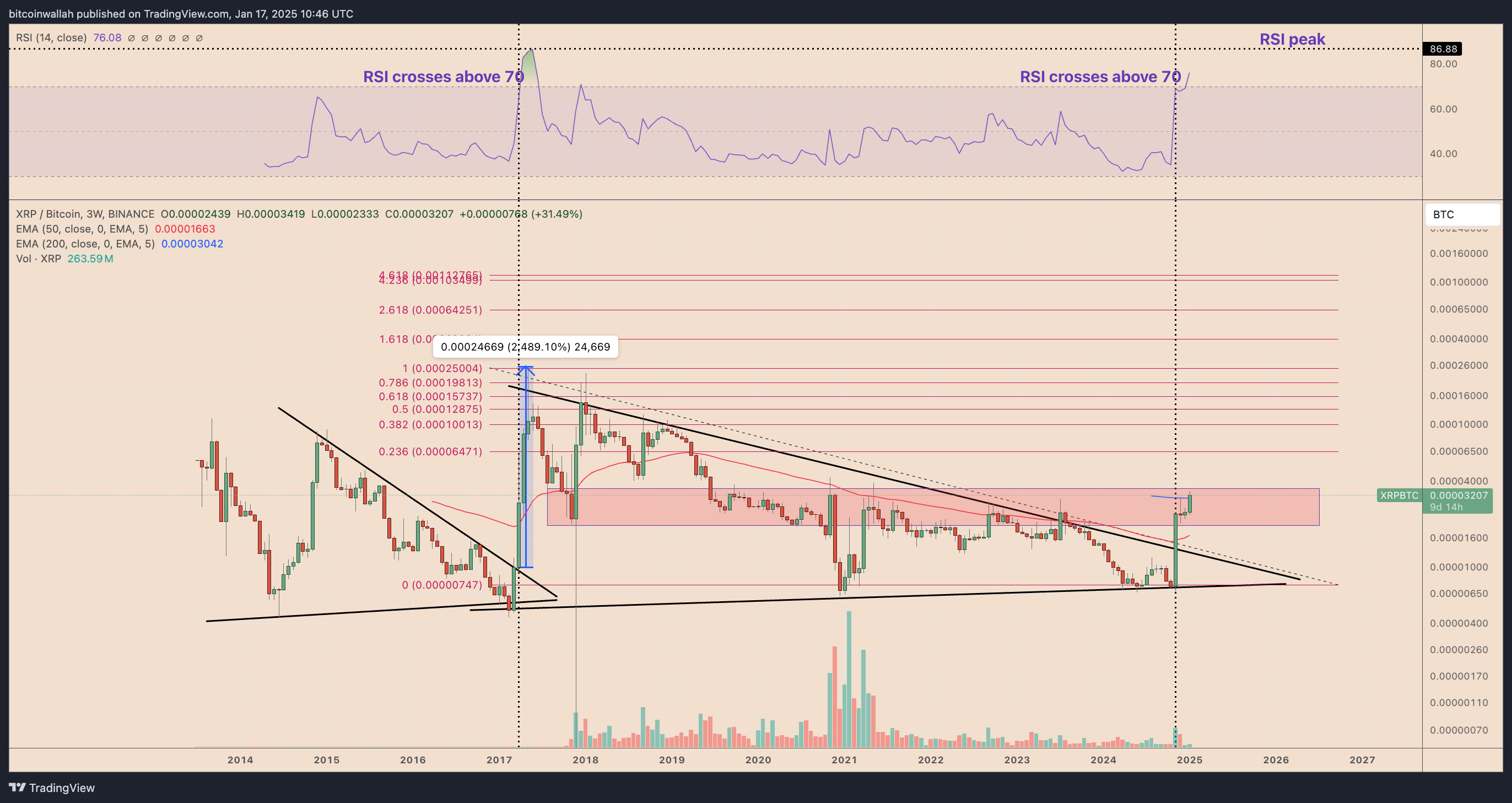 XRP/BTC tăng gần 32% vào tháng 1 năm 2025, vượt qua các mức kháng cự quan trọng và bước vào vùng quá mua dựa trên chỉ số sức mạnh tương đối (RSI). Lần cuối cùng XRP/BTC chứng kiến mức RSI như vậy là vào đầu năm 2017, ngay trước đợt tăng giá 2.500%.