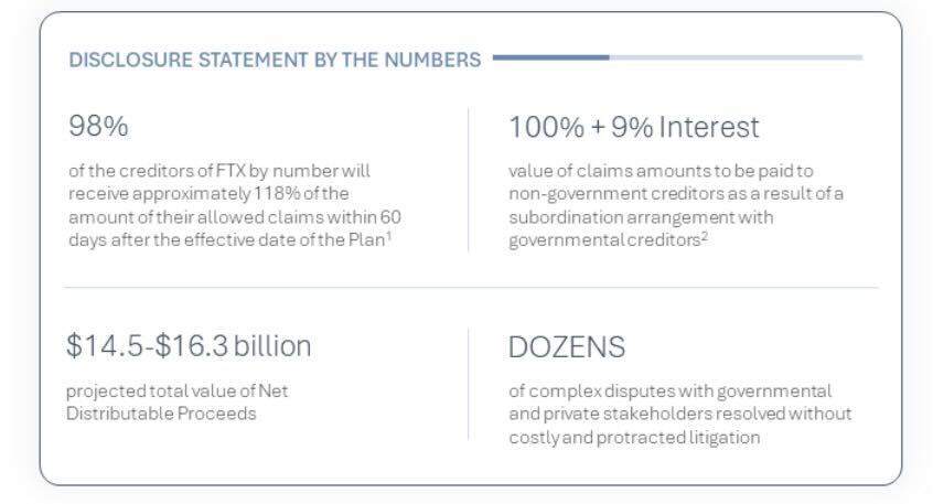 FTX muốn cung cấp cho 98% chủ nợ của mình tới 118% yêu cầu bồi thường của họ, trong khi phần còn lại sẽ được hoàn trả đầy đủ cộng với “hàng tỷ USD bồi thường cho giá trị thời gian của khoản đầu tư của họ”.