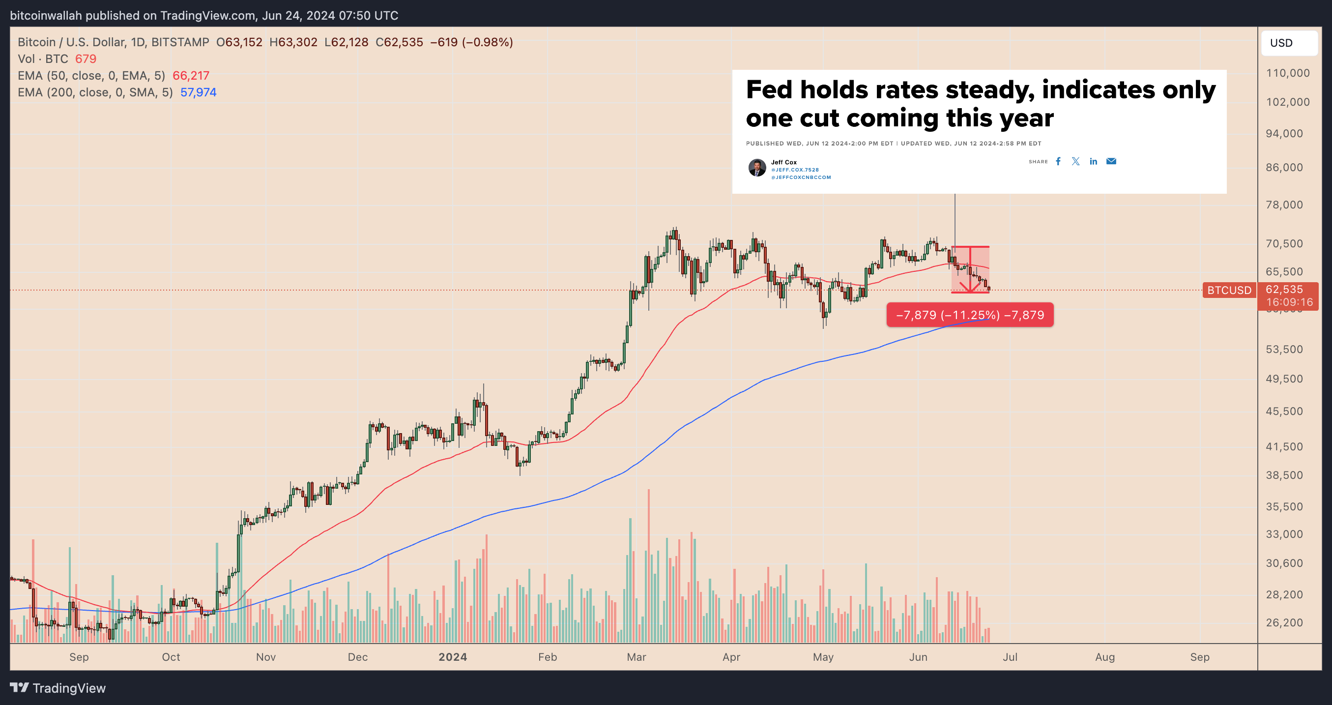 Biểu đồ giá hàng ngày của BTC/USD với phản ứng của thị trường trước triển vọng ít ôn hòa hơn của Fed. Nguồn: TradingView.