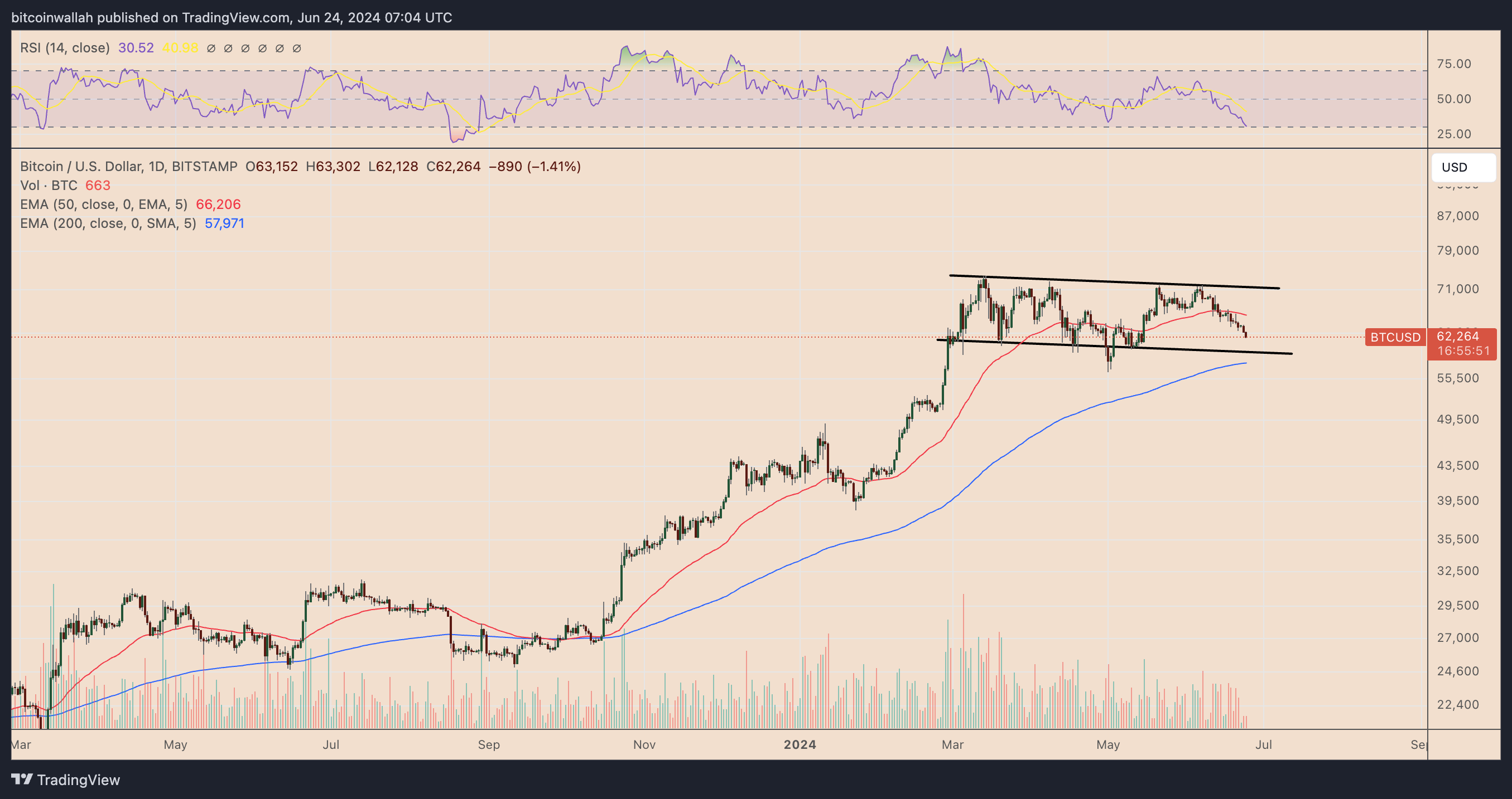 Giá Bitcoin (BTC) tiếp tục giảm, giảm 1,5% trong ngày và 7,65% trong tuần qua để đạt 62.130 USD vào ngày 24 tháng 6. Khả năng phục hồi những khoản lỗ này có vẻ khó xảy ra trong những ngày tới với một số chỉ báo cho thấy giá sẽ còn trượt dốc nhiều hơn.