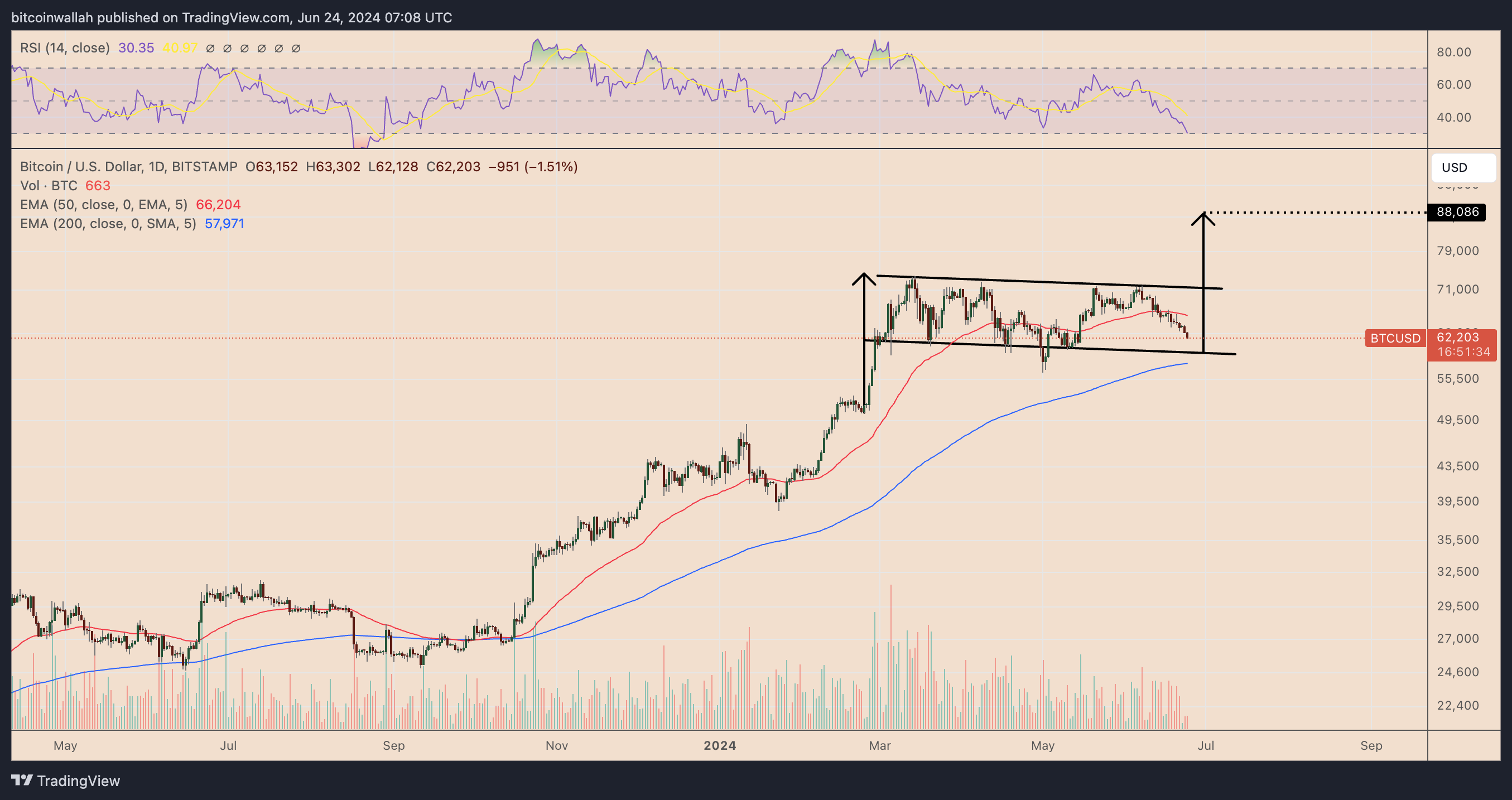 Cờ tăng thường giải quyết sau khi giá phá vỡ trên đường xu hướng trên và tăng bằng với chiều cao của xu hướng tăng trước đó. Điều này đặt mục tiêu giá Bitcoin ở mức 88.000 USD — mức cao kỷ lục mới — làm mục tiêu tăng giá chính cho tháng 7 hoặc tháng 8, nếu kịch bản tăng giá này diễn ra.