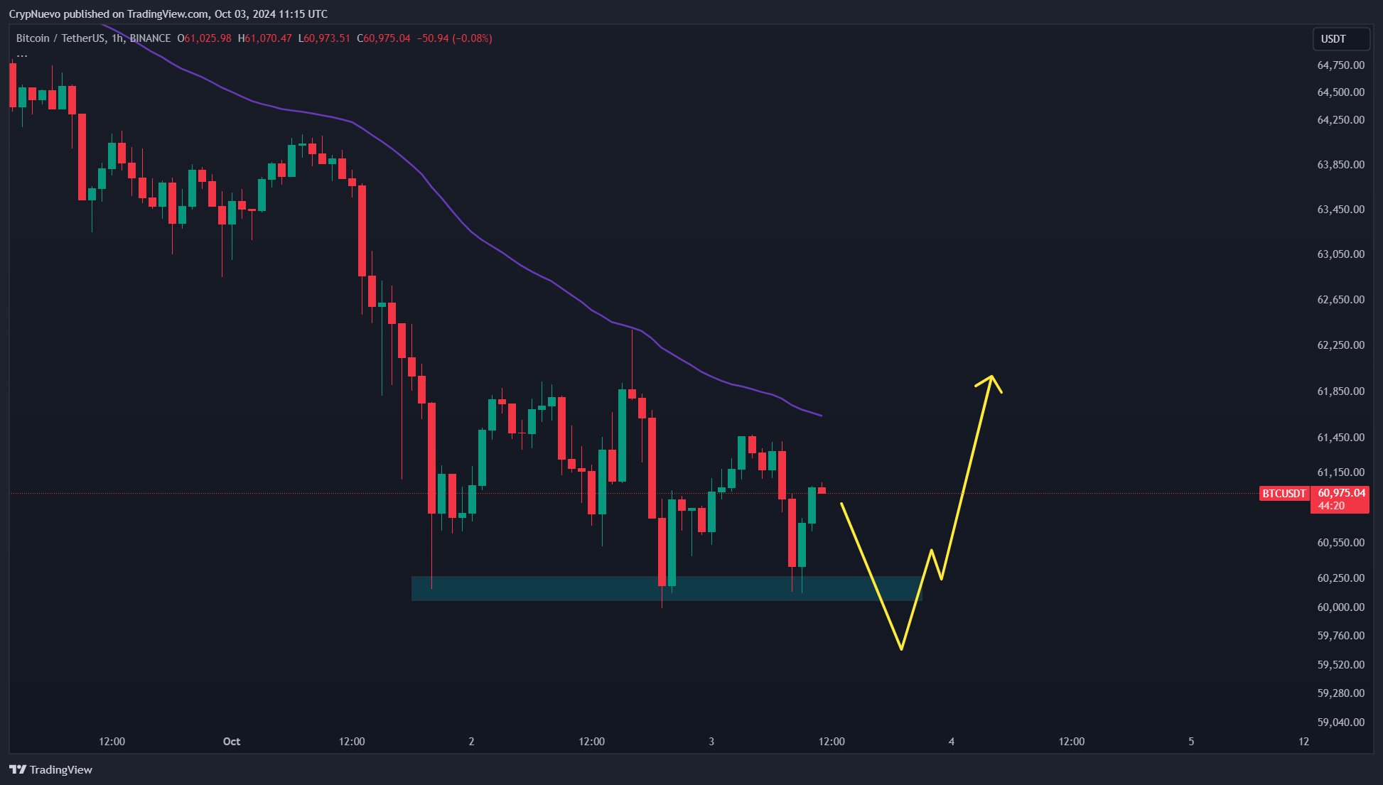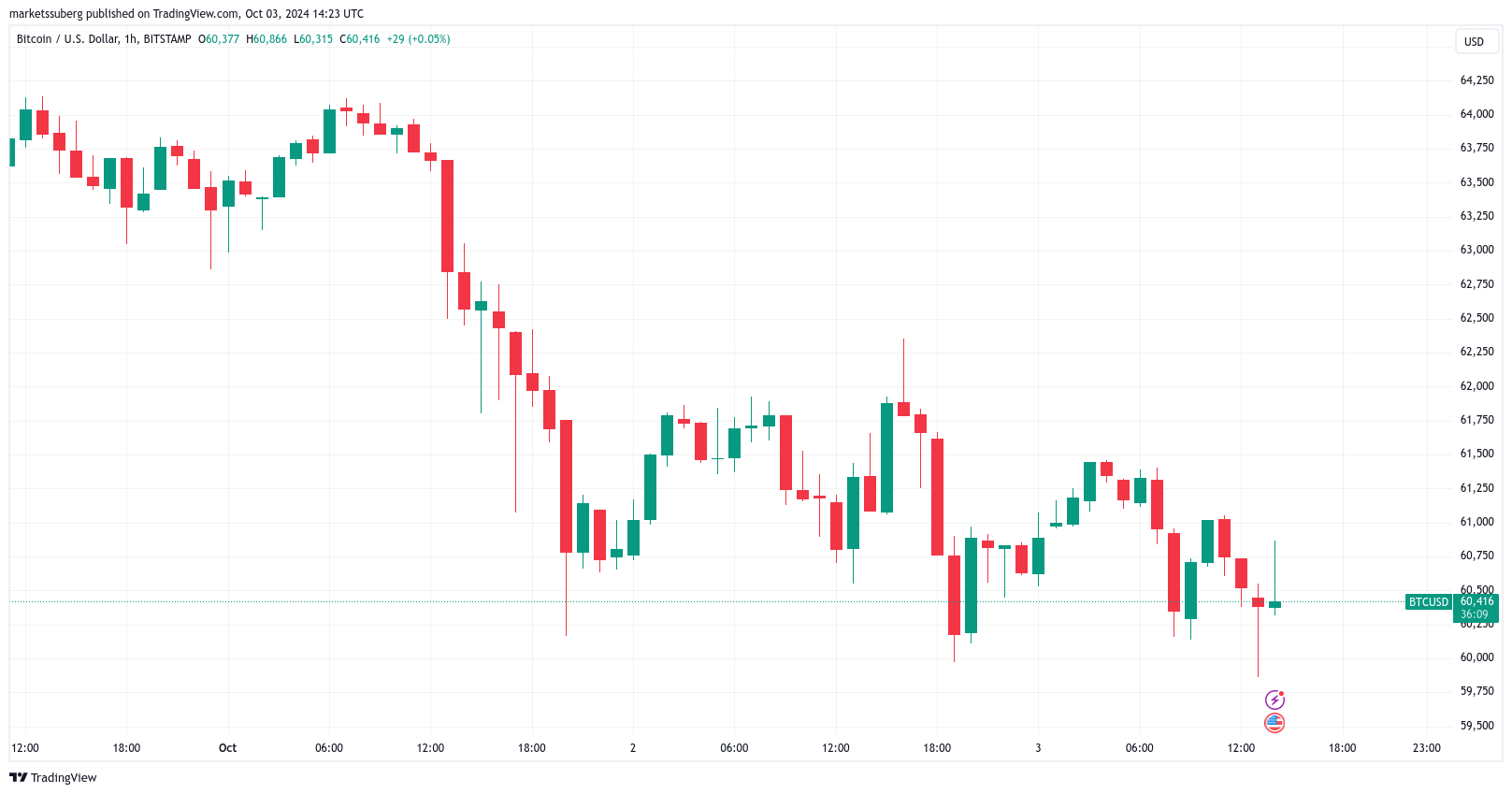 Dữ liệu từ TradingView cho thấy giá BTC chạm mức thấp cục bộ mới là 59.860 USD trên Bitstamp.