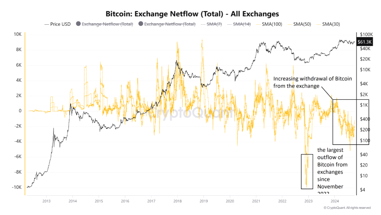 Bài đăng bình luận rằng: “Dữ liệu trên chuỗi cho thấy dòng Bitcoin chảy ra khỏi các sàn giao dịch đang tăng lên – cả ba đường trung bình động 30, 50 và 100 ngày đều cho thấy điều này”.