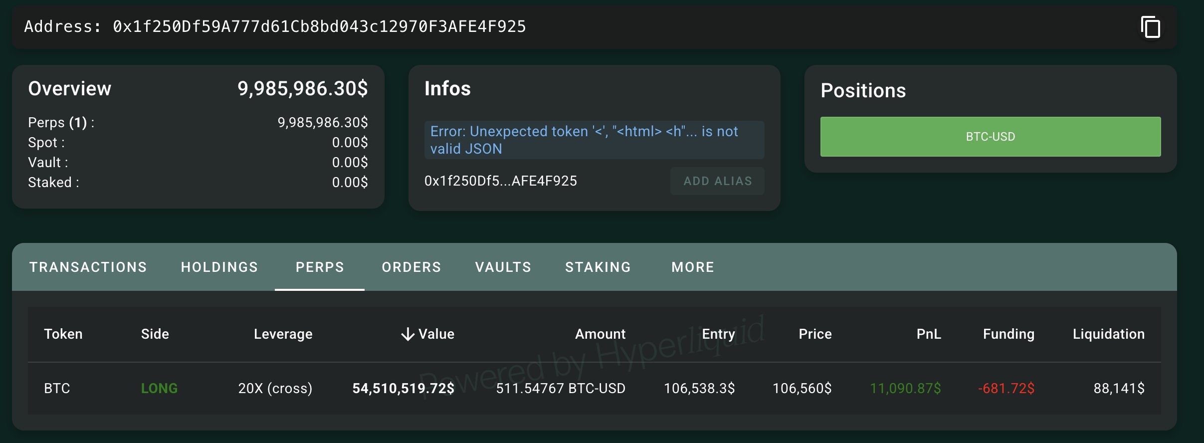 Today, a whale created a new wallet “0x1f25”, deposited 10M $USDC to #Hyperliquid, and opened a 20x leveraged long position on $BTC.