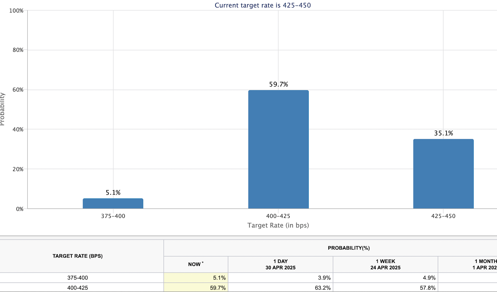 Xác suất Fed cắt giảm lãi suất trong cuộc họp ngày 18/6 của Ủy ban Thị trường Mở Liên bang (FOMC) cũng đã tăng trong tuần qua — từ 57% vào ngày 30/4 lên 60% vào ngày 1/5.