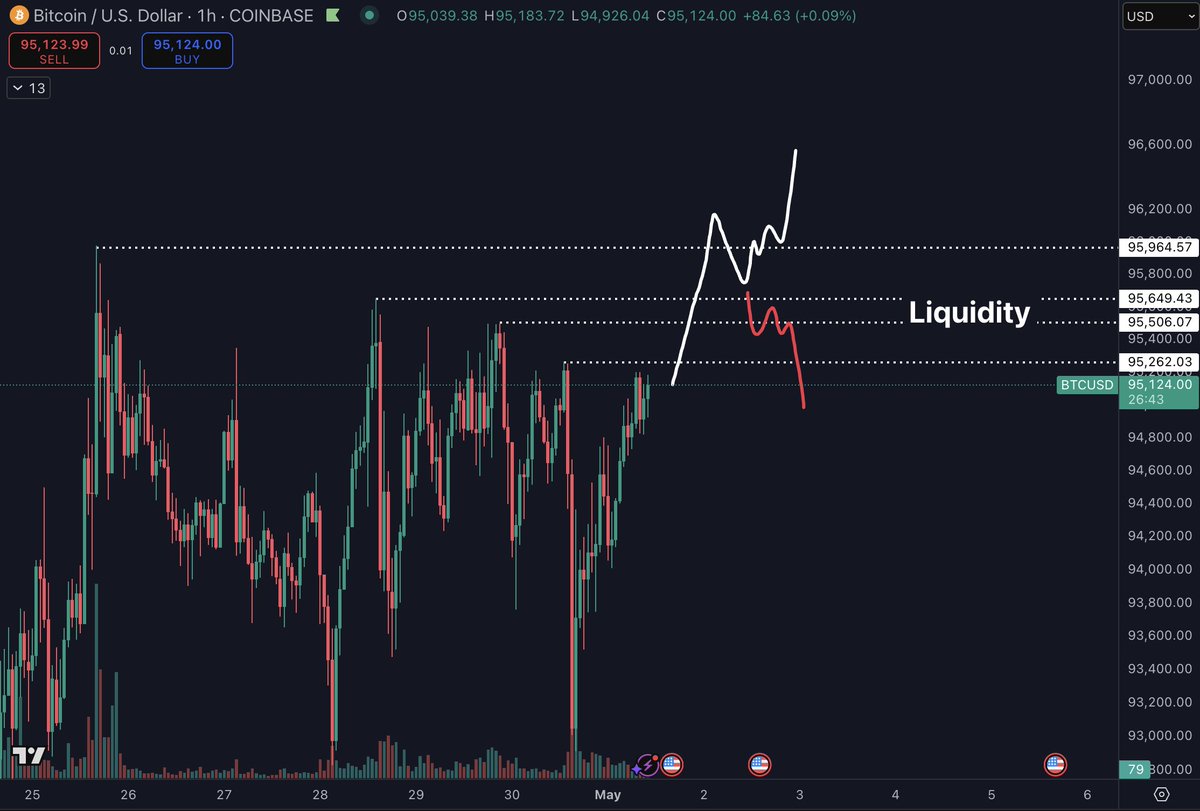 “Bitcoin tăng vọt trở lại mức 95.000 USD, phục hồi sau dữ liệu GDP bi quan của Hoa Kỳ”, nhà phân tích Bitcoin ẩn danh BTCmoonmath cho biết trong bài đăng ngày 1 tháng 5 trên X, đồng thời nói thêm: