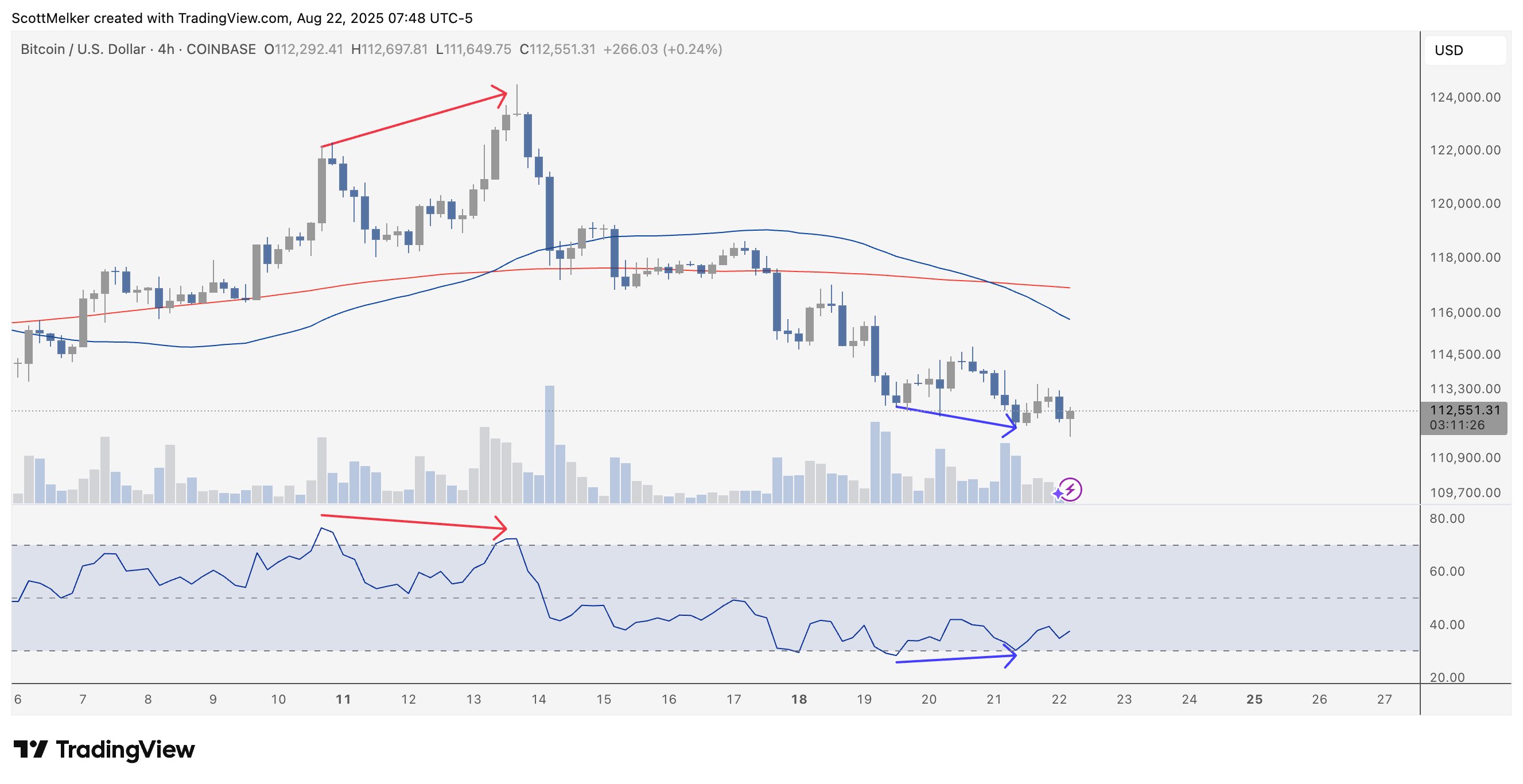 “Bitcoin đang cho thấy sự phân kỳ tăng giá (một lần nữa) với RSI quá bán trên đường 4 giờ… và 6 giờ. Có thể là đường 12 giờ. Có thể là đường hàng ngày. Tất cả đều ở mức hỗ trợ quan trọng 112.000 USD”, nhà giao dịch, nhà phân tích và người dẫn chương trình podcast Scott Melker, được biết đến với biệt danh “Sói già phố Wall”, nói ngay trước khi Powell bắt đầu bài phát biểu.