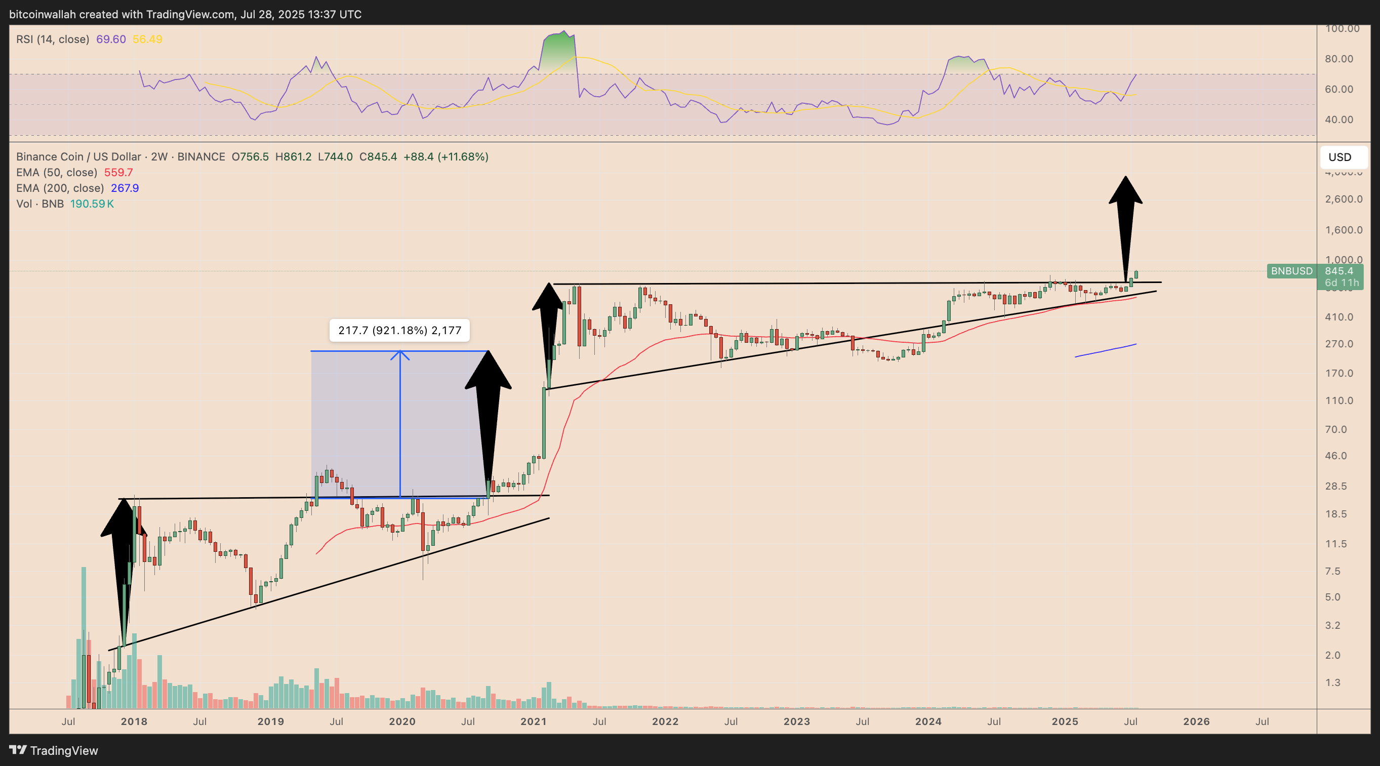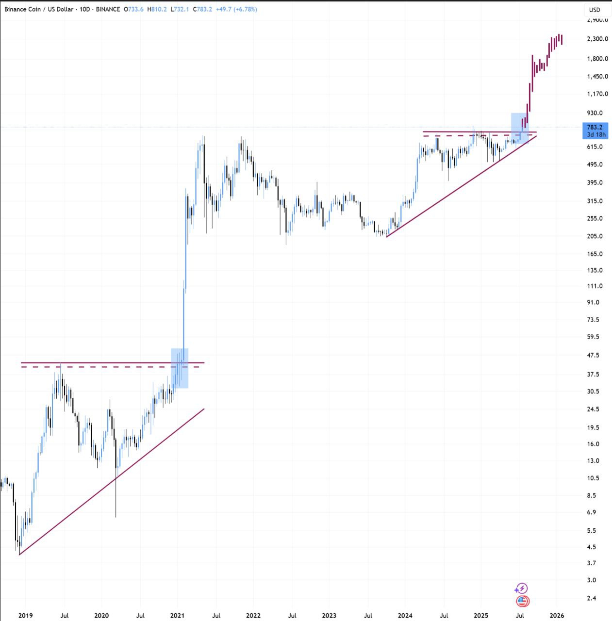 Về mặt kỹ thuật, BNB đã phá vỡ mô hình tam giác tăng dần kéo dài nhiều năm — một mẫu hình tiếp diễn tăng giá — và rất giống với cấu trúc kỹ thuật của giai đoạn 2018 đến 2021, trước khi BNB thực hiện một cú bứt phá lớn.