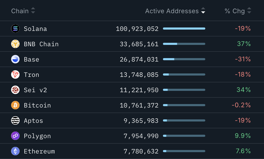 Điều đó đánh dấu một trong những tỷ lệ tăng trưởng cao nhất về địa chỉ hoạt động trong số các blockchain lớn, thậm chí còn vượt qua Solana (SOL), mặc dù dẫn đầu về tổng số địa chỉ hoạt động với hơn 100 triệu, nhưng hoạt động của người dùng đã giảm 19% trong cùng kỳ.