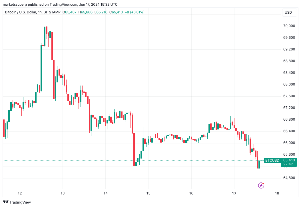 Dữ liệu từ TradingView cho thấy Bitcoin (BTC) giảm xuống còn 65.066 USD trên Bitstamp, gần bằng mức thấp nhất trong một tháng kể vào ngày 14 tháng 6.