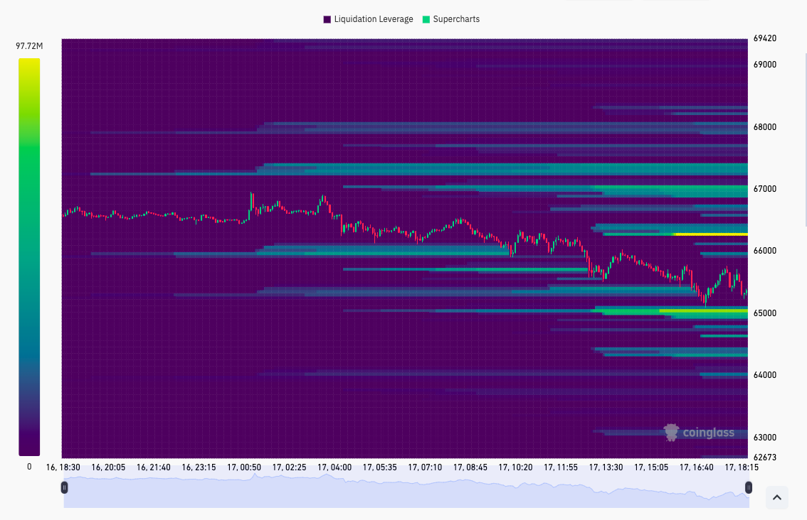 “Mức thanh khoản lớn ở mức 65 nghìn USD và 66,3 nghìn USD. Hãy nhớ rằng, sẽ luôn có các cấp độ ở cả hai bên và không phải lúc nào chúng cũng được khai thác. Các mức này có thể hoạt động như một nam châm khi giá giao dịch gần với nó”, nhà giao dịch Daan Crypto Trades nhận xét cùng với dữ liệu thanh khoản của sổ đặt lệnh từ CoinGlass.
