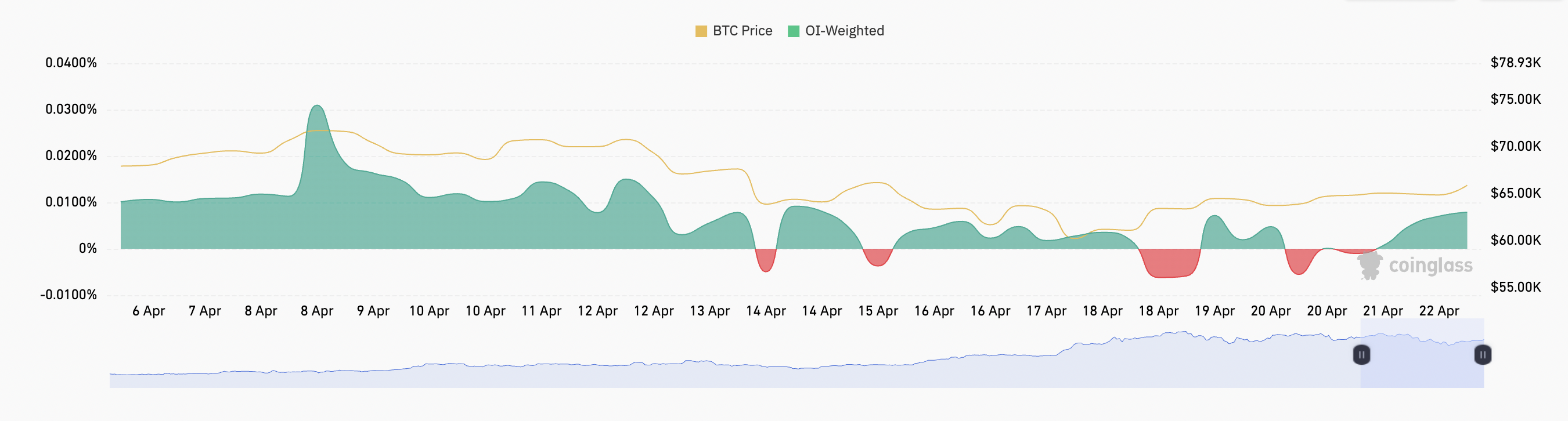 Dữ liệu từ Coinglass tiết lộ rằng tỷ lệ tài trợ lãi suất mở (OI) của Bitcoin chuyển sang âm vào ngày 18 tháng 4 và một lần nữa vào ngày 21 tháng 4. Số liệu hiện đã trở lại vùng tích cực và dừng ở mức 0,0079% vào ngày 22 tháng 4, cho thấy nhu cầu mua các vị thế long ngày càng tăng.