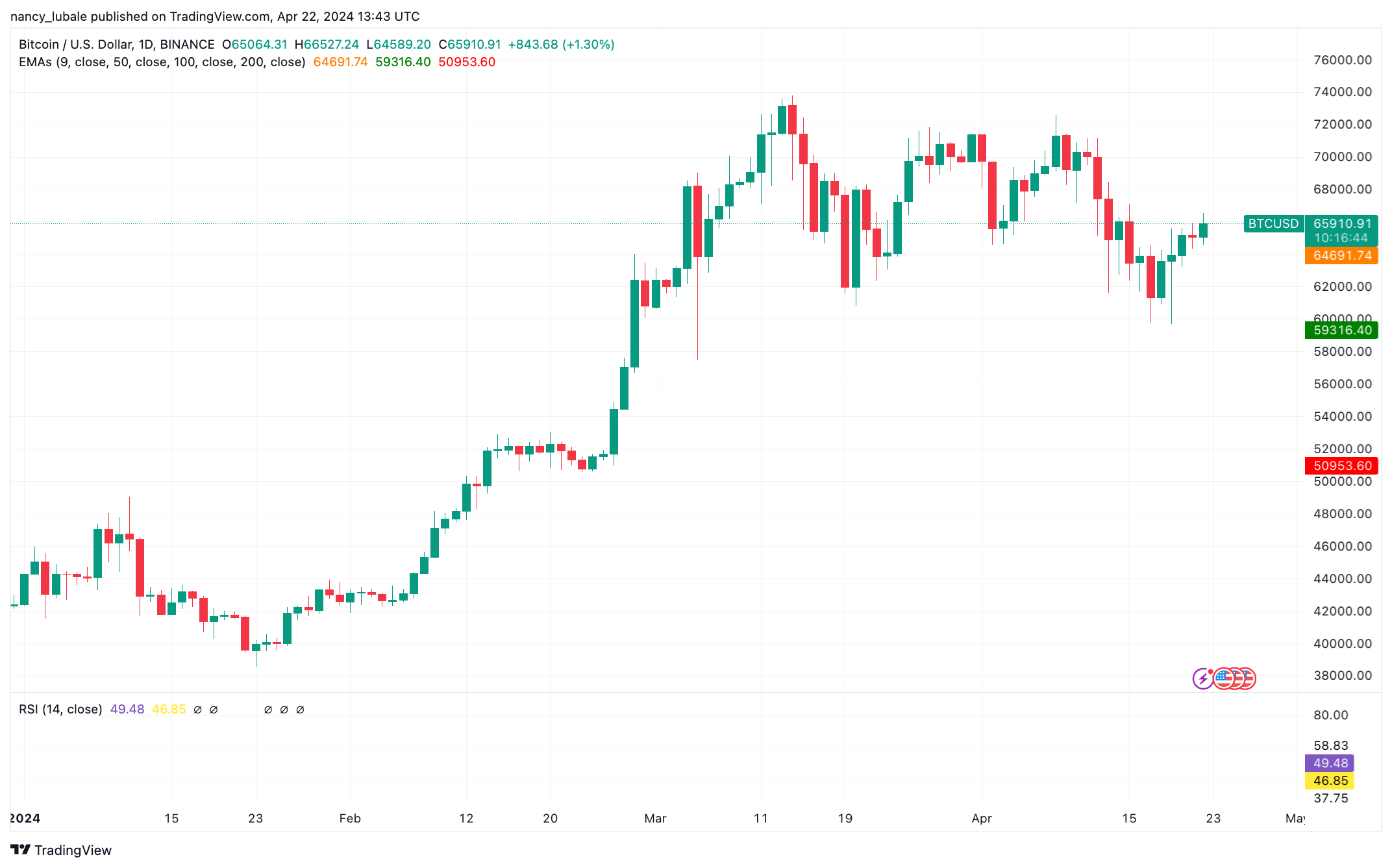 Bitcoin đánh dấu mức đóng cửa hàng ngày cao nhất trong hơn 10 ngày vào ngày 21 tháng 4, lấy lại mức 65.000 USD. Giá BTC đã tăng từ mức thấp 64.346 USD vào ngày 21 tháng 4, tăng 3,5% lên mức cao nhất trong ngày là 67.227 USD vào ngày 23 tháng 4.