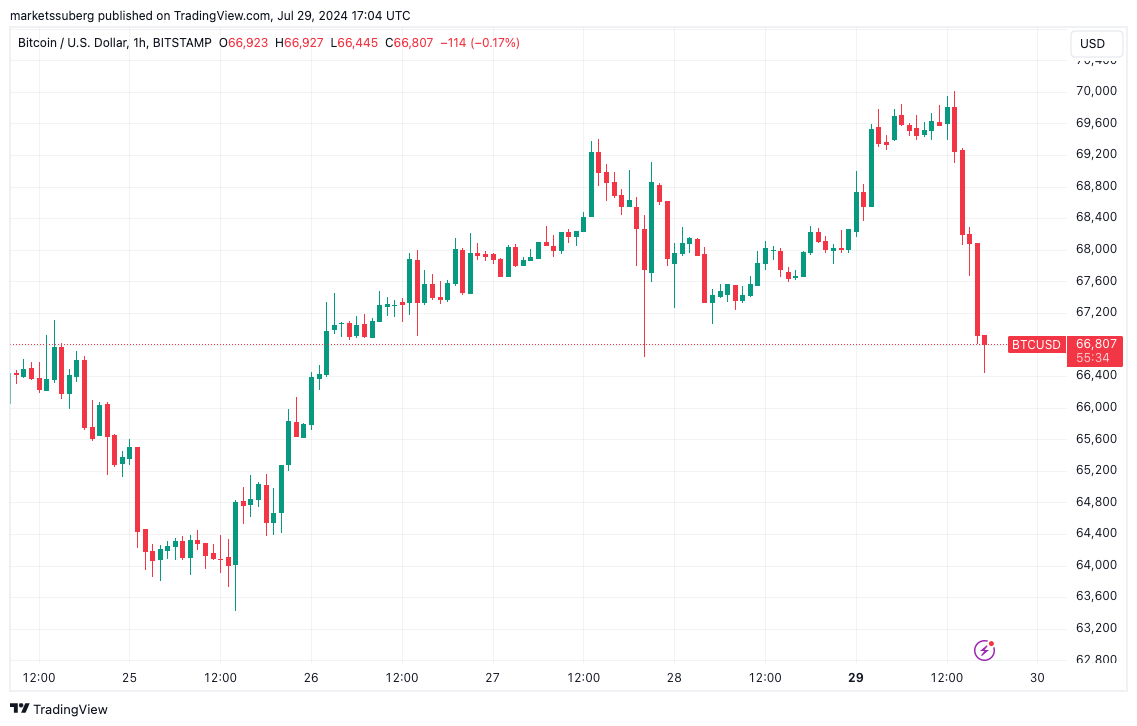 Bitcoin phải chịu áp lực bán lớn sau khi Phố Wall mở cửa phiên giao dịch ngày 29 tháng 7 khi người bán kiên quyết từ chối mức giá 70.000 USD.