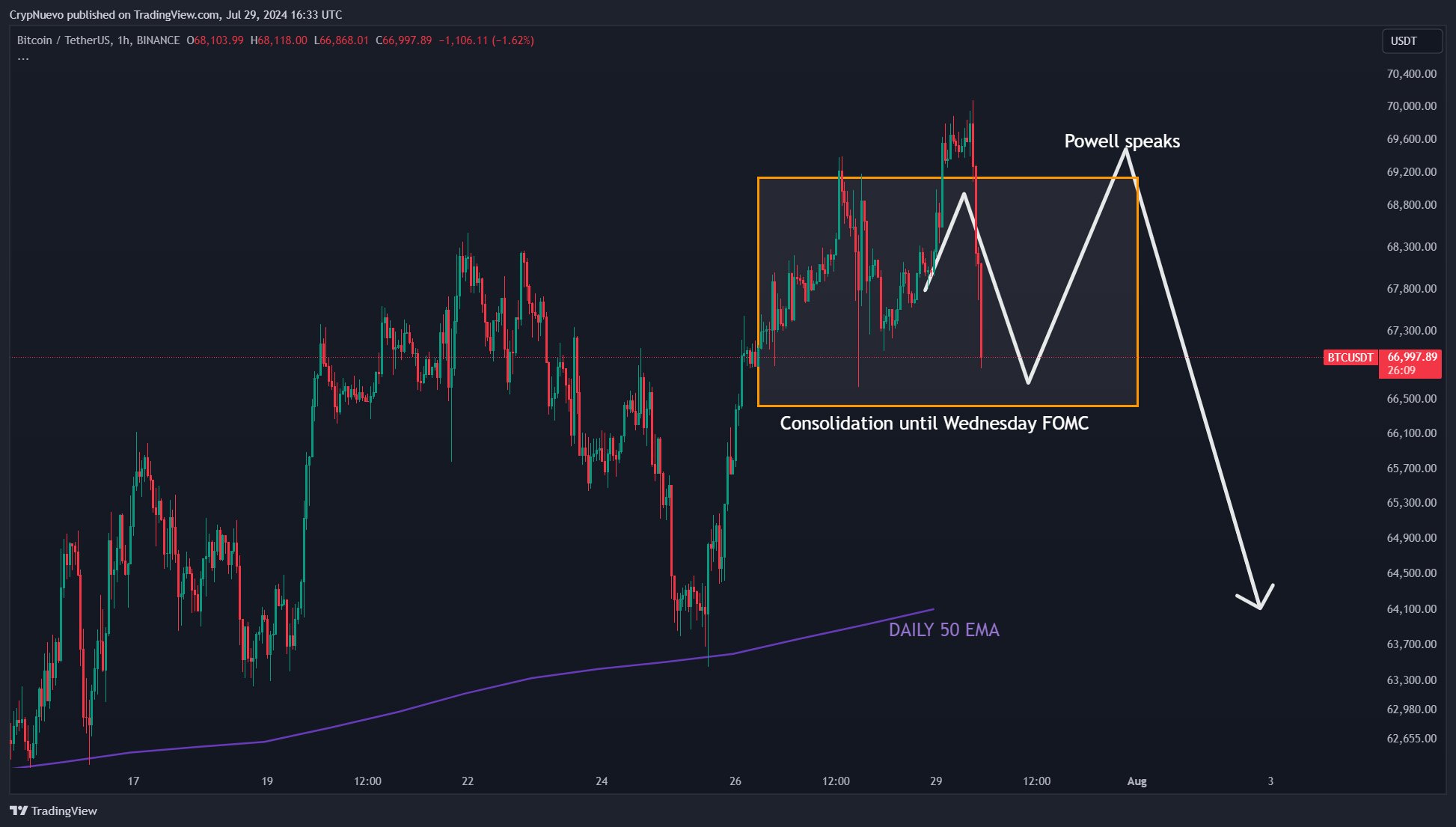 CrypNuevo đã tải lại biểu đồ hiện có cho thấy quỹ đạo giá BTC tiềm năng xung quanh quyết định của Fed, dự kiến công bố vào ngày 31 tháng 7.
