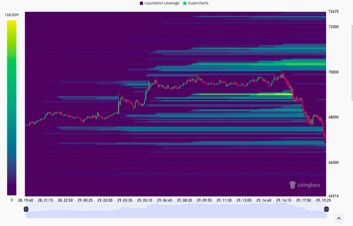 eyeing $67K now, below there likely see continuation of forced selling due to longs closing and some take profit selling https://t.co/KQif4j2wpJ pic.twitter.com/WvoFpGIPf4